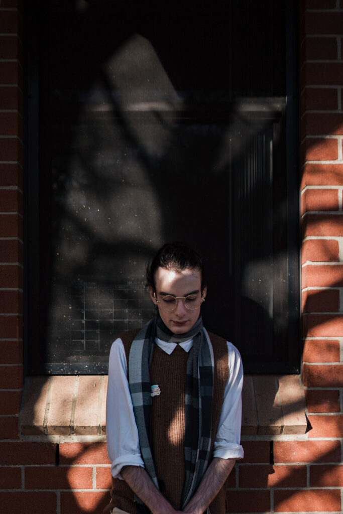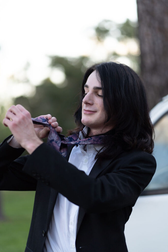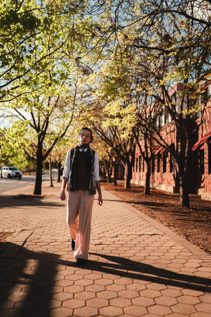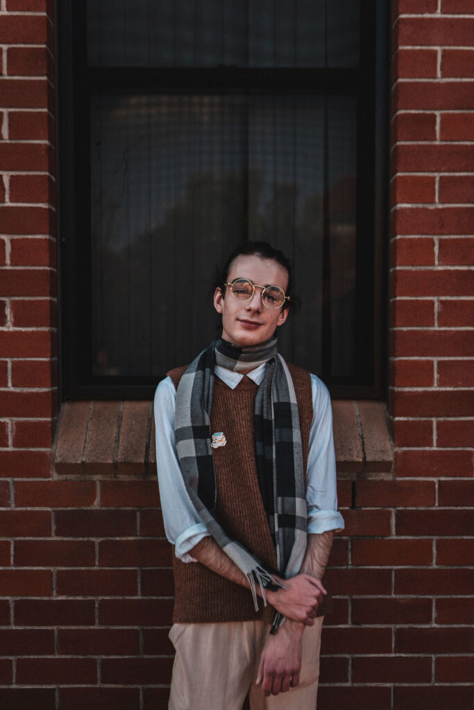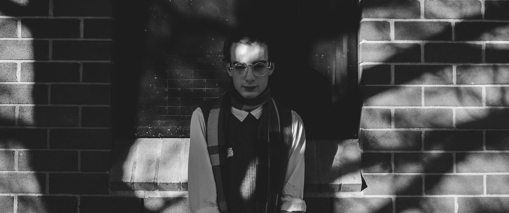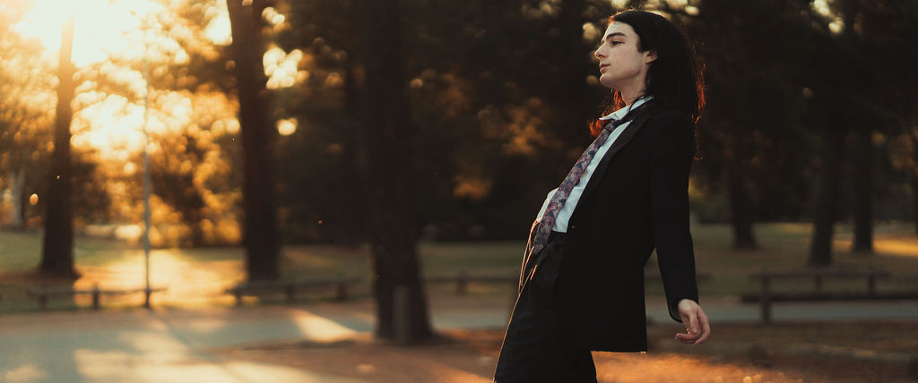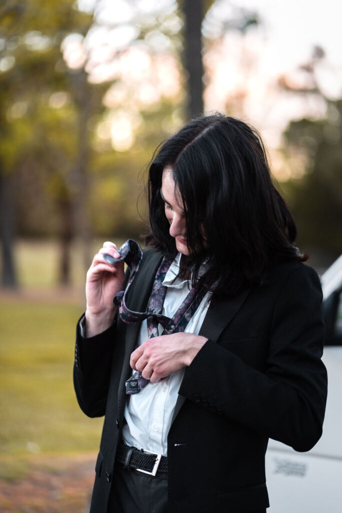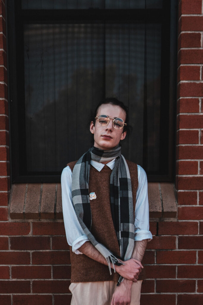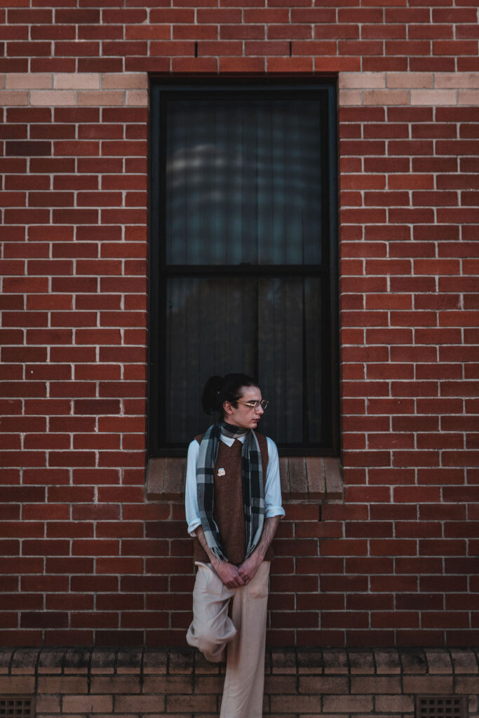 The outfit that became Leslie Grey. The beginnings of gender non-conformity, and probably the first time I properly tied my hair back (apart from my brother’s wedding). It still sticks out a bit at the sides. I need to figure out what to do when that happens. Tony and I shot these at Tuggeranong Library. I don’t wear glasses, by the way. But the more astute will notice they are the same I wore for Richard Grills in Dangerous Conceits. I…might have stolen them.