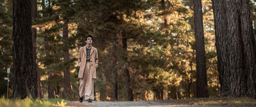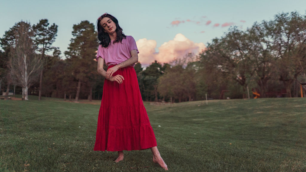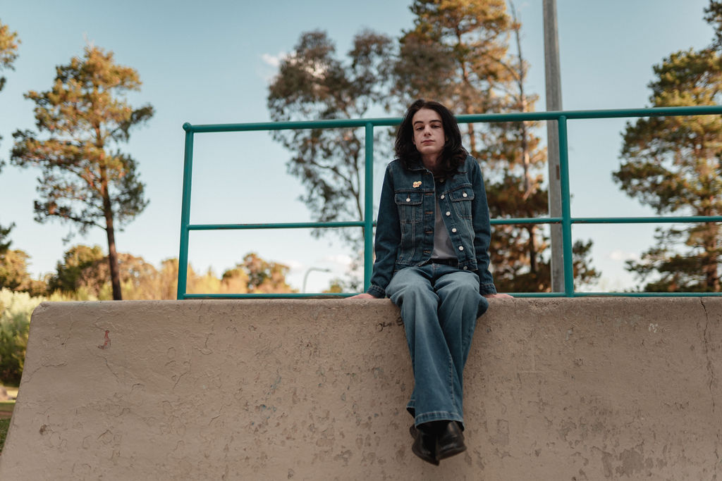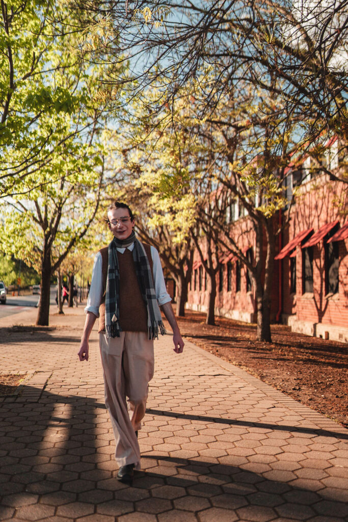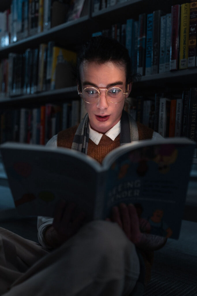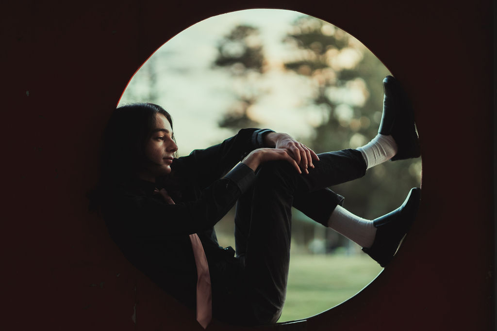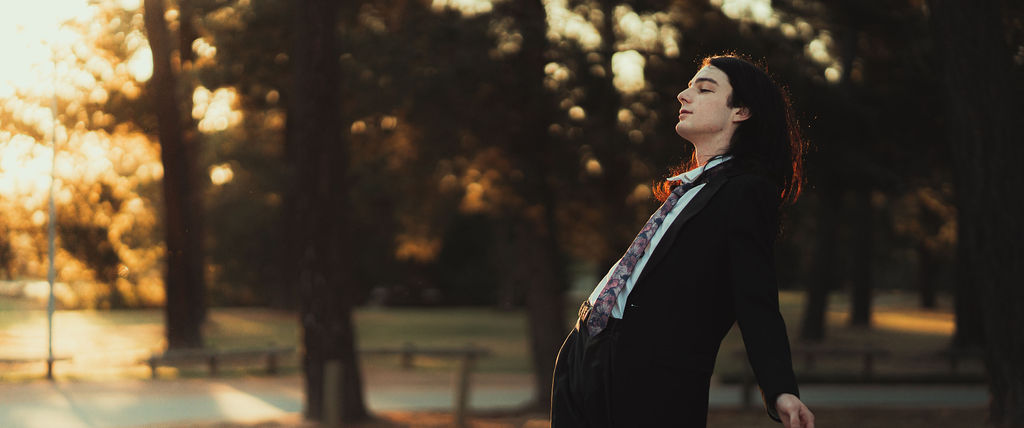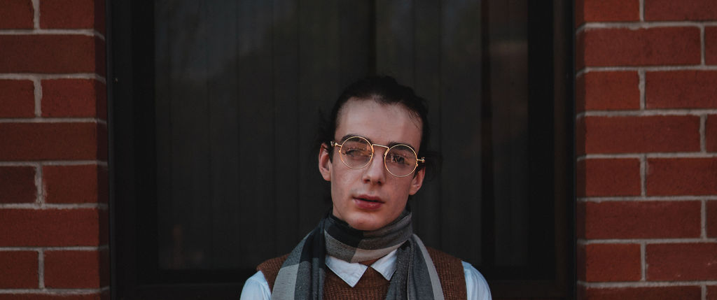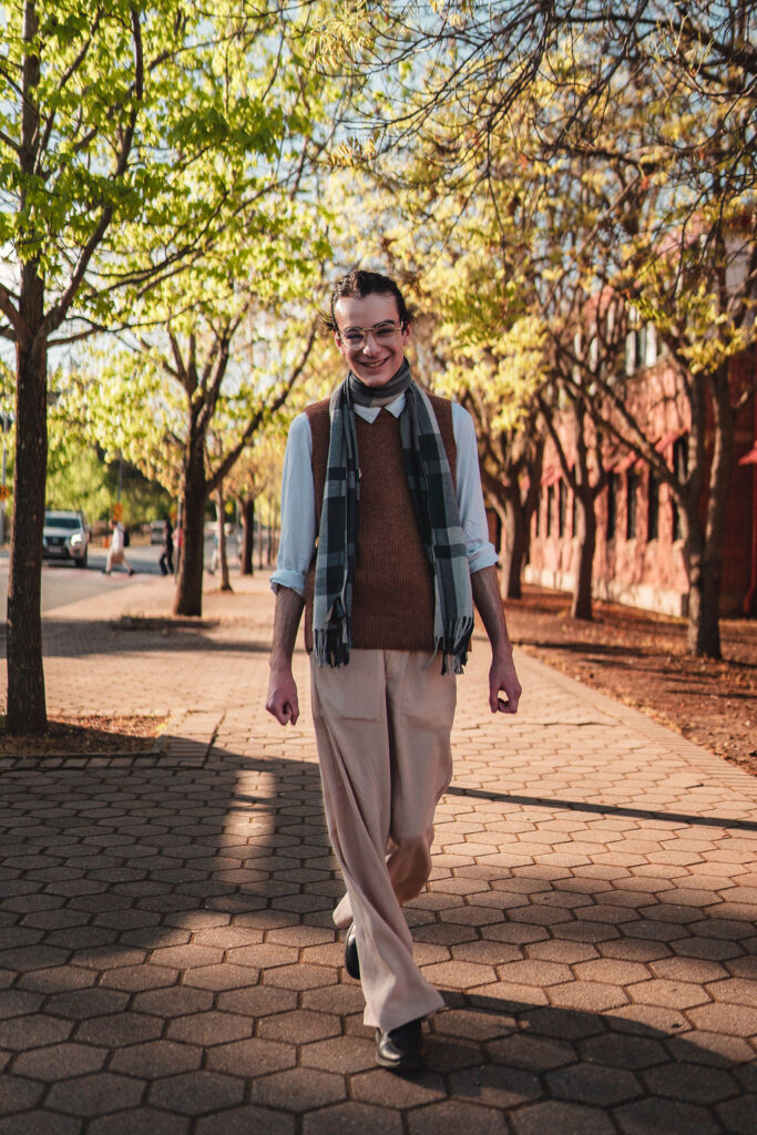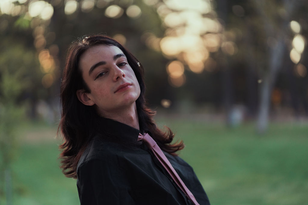 The outfit that became Leslie Grey. The beginnings of gender non-conformity, and probably the first time I properly tied my hair back (apart from my brother’s wedding). It still sticks out a bit at the sides. I need to figure out what to do when that happens. Tony and I shot these at Tuggeranong Library. I don’t wear glasses, by the way. But the more astute will notice they are the same I wore for Richard Grills in Dangerous Conceits. I…might have stolen them.