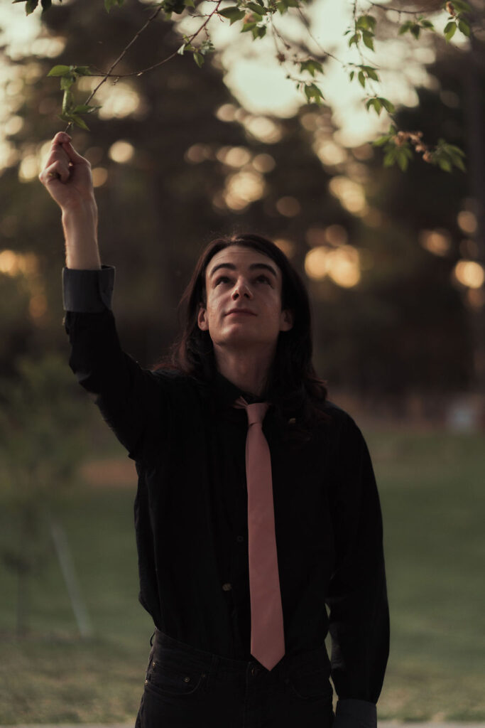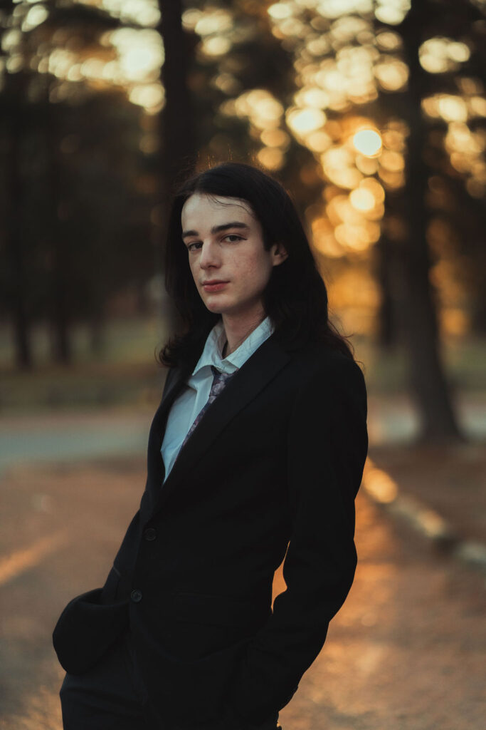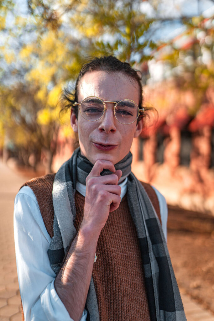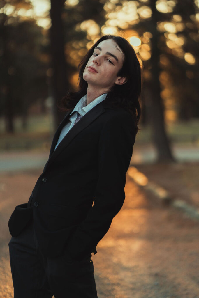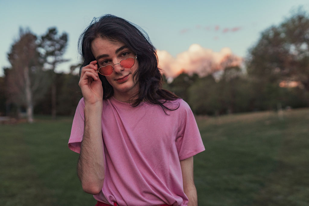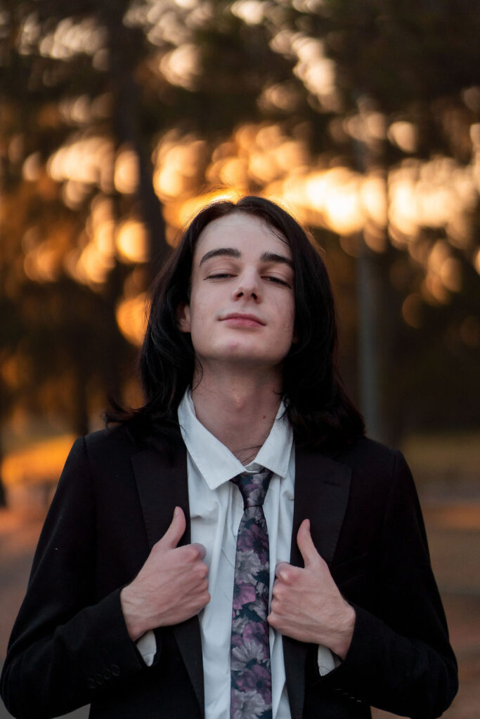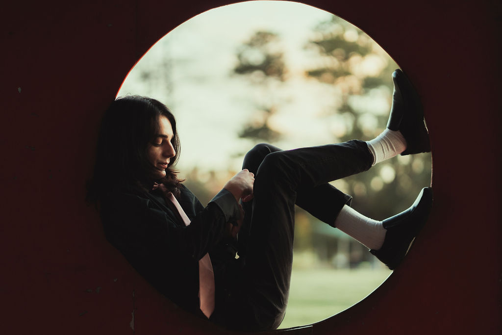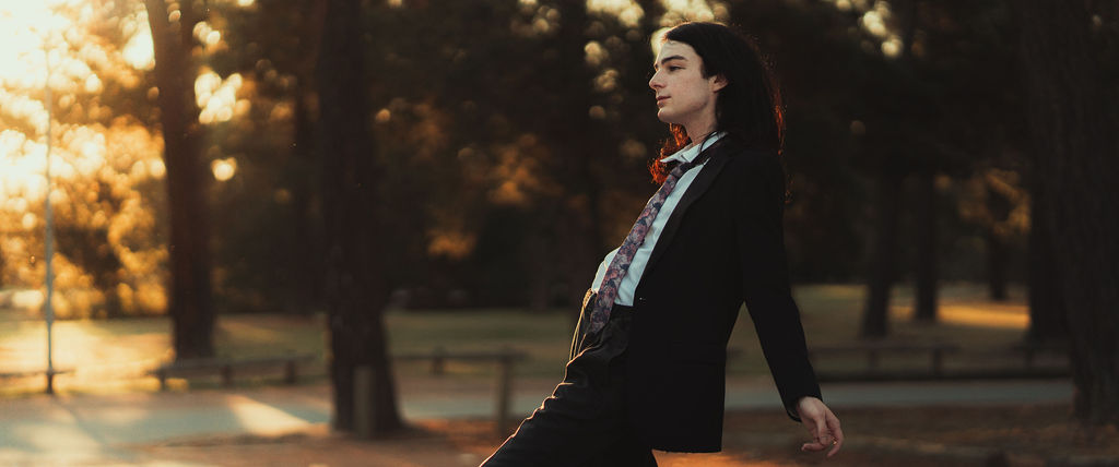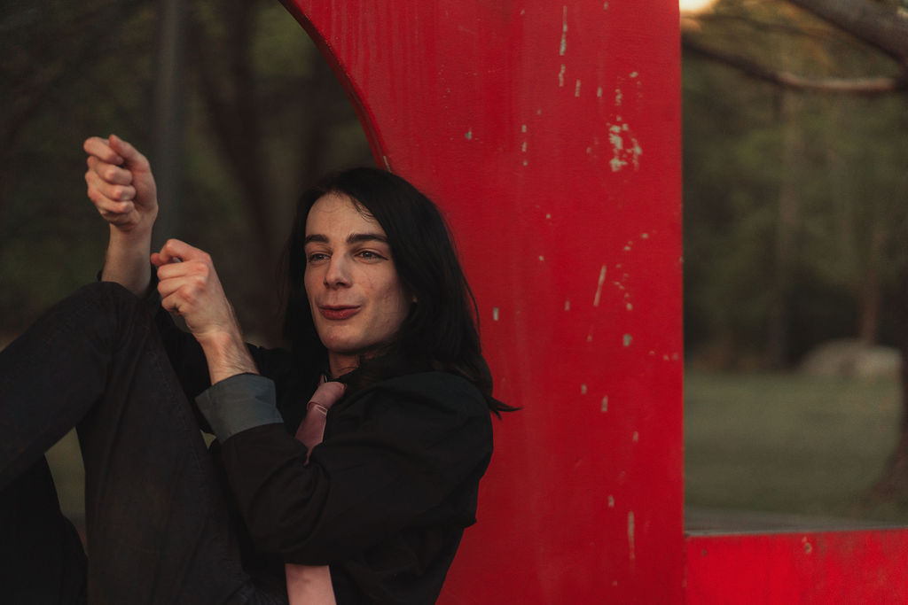 The outfit that became Leslie Grey. The beginnings of gender non-conformity, and probably the first time I properly tied my hair back (apart from my brother’s wedding). It still sticks out a bit at the sides. I need to figure out what to do when that happens. Tony and I shot these at Tuggeranong Library. I don’t wear glasses, by the way. But the more astute will notice they are the same I wore for Richard Grills in Dangerous Conceits. I…might have stolen them.