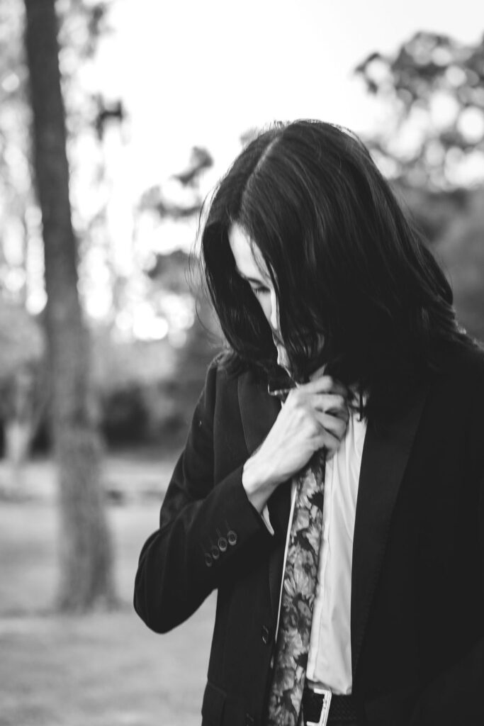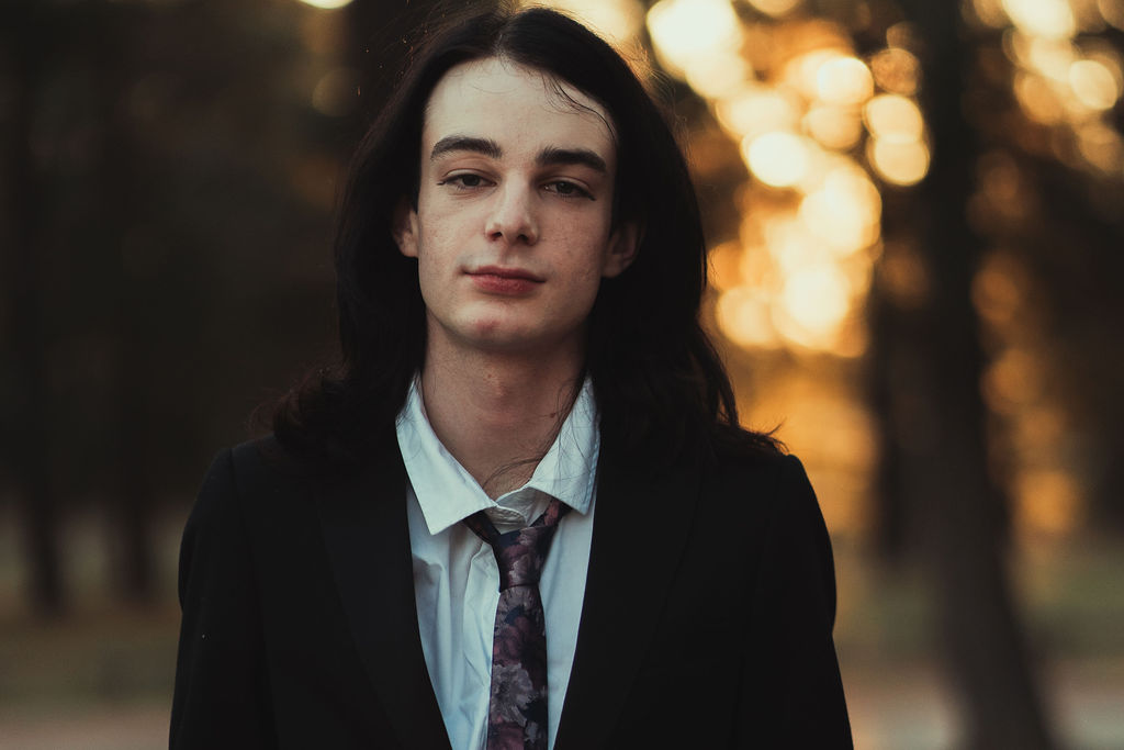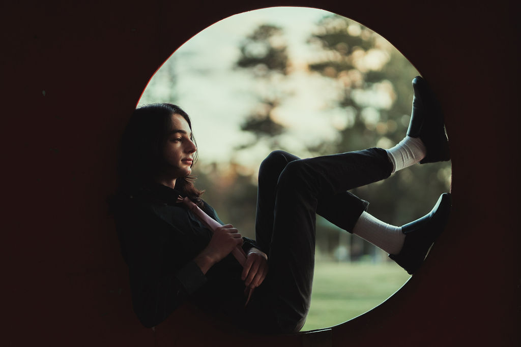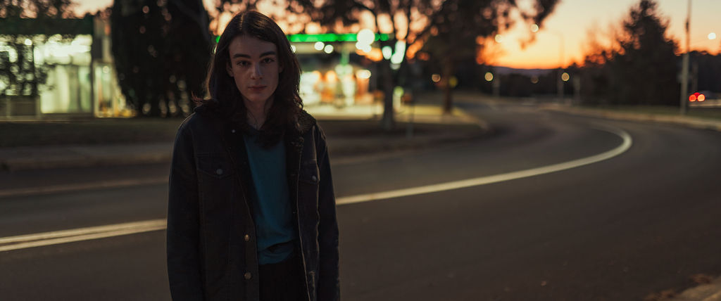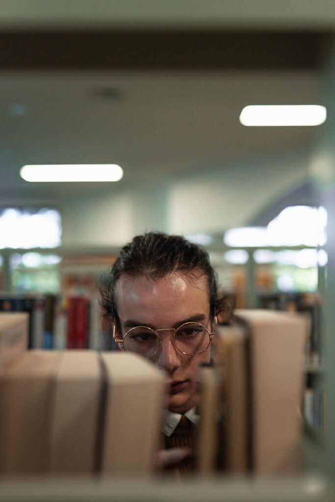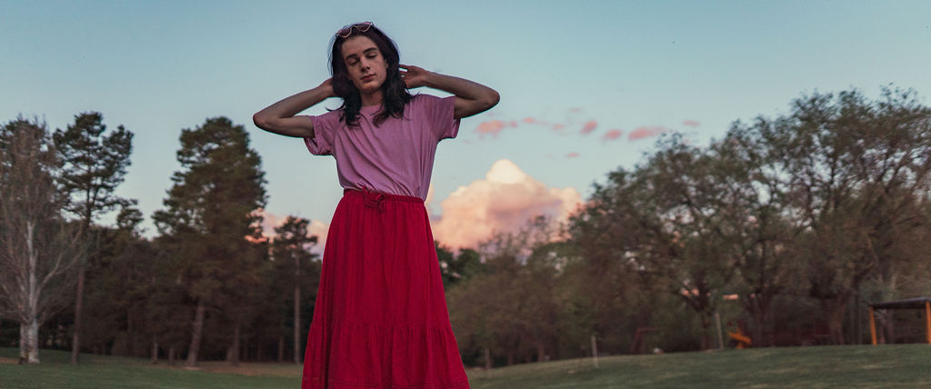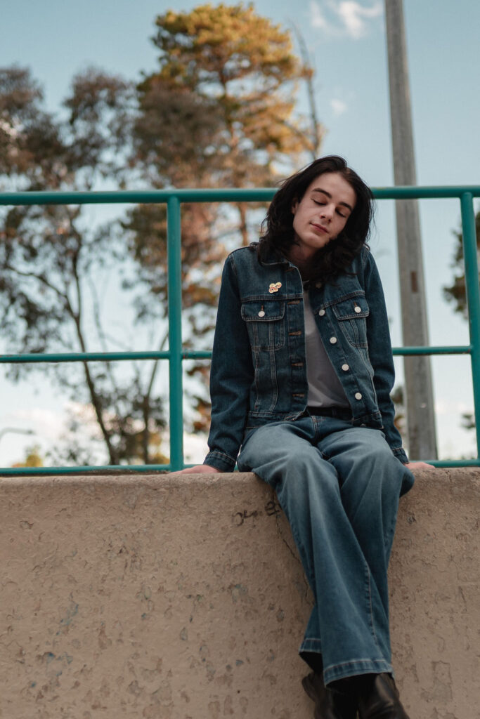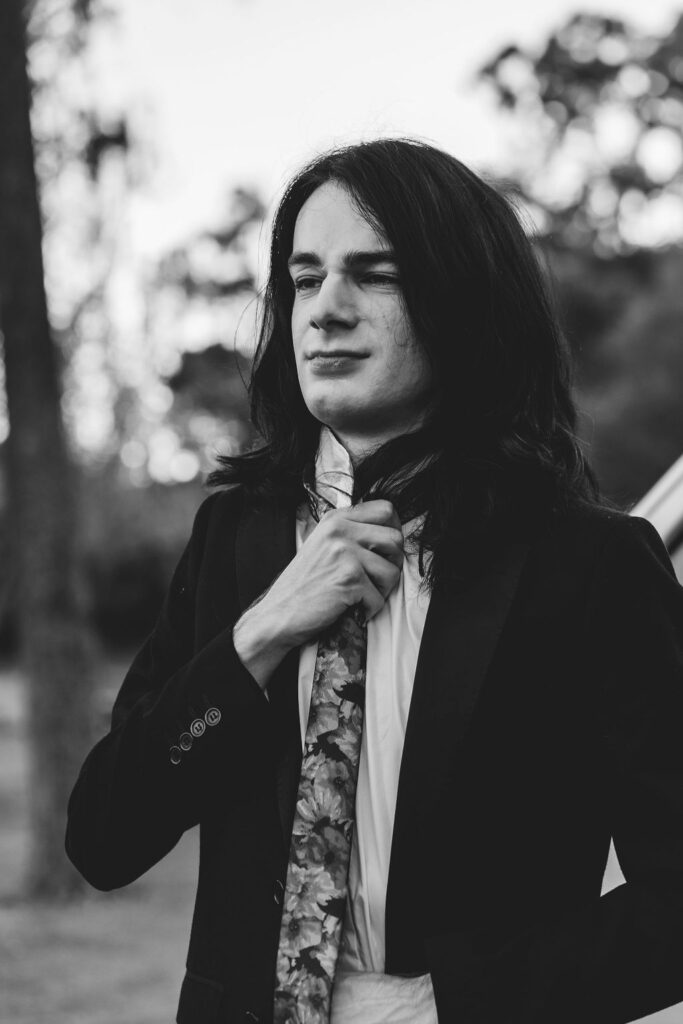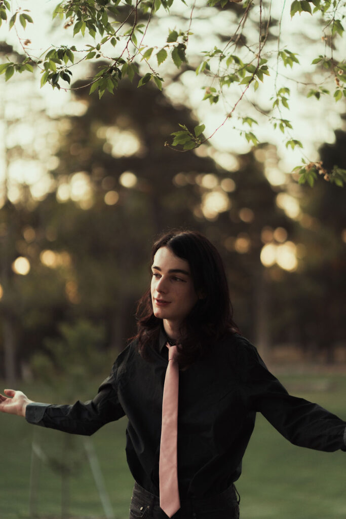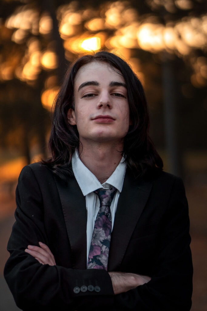 The outfit that became Leslie Grey. The beginnings of gender non-conformity, and probably the first time I properly tied my hair back (apart from my brother’s wedding). It still sticks out a bit at the sides. I need to figure out what to do when that happens. Tony and I shot these at Tuggeranong Library. I don’t wear glasses, by the way. But the more astute will notice they are the same I wore for Richard Grills in Dangerous Conceits. I…might have stolen them.