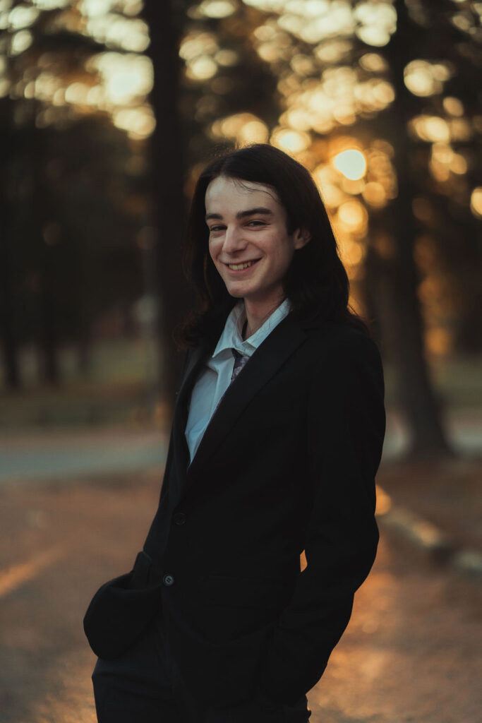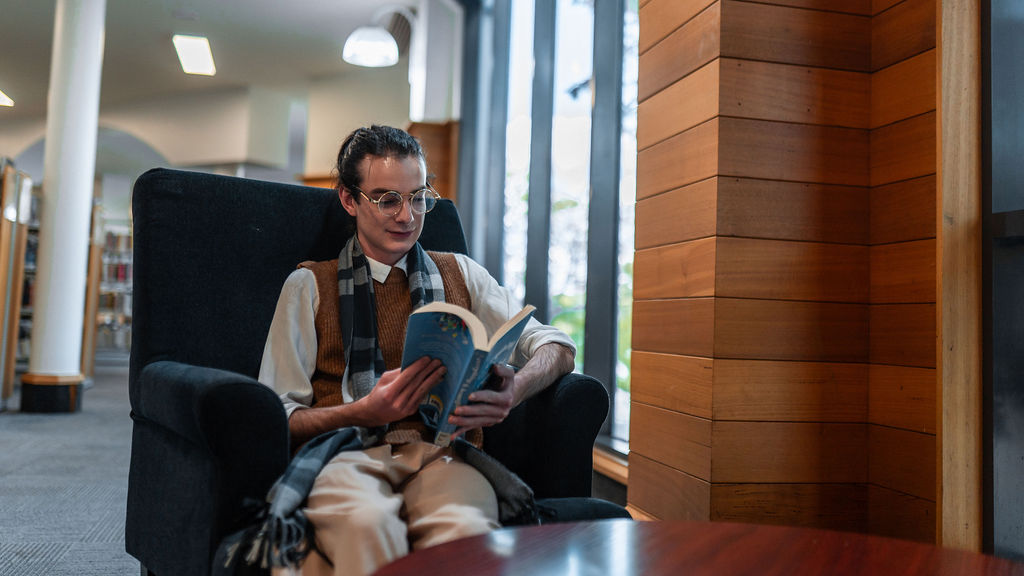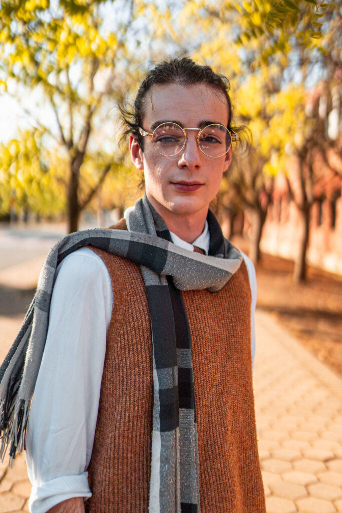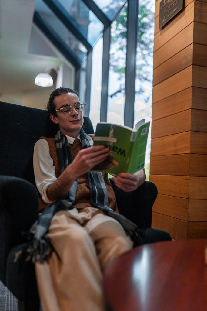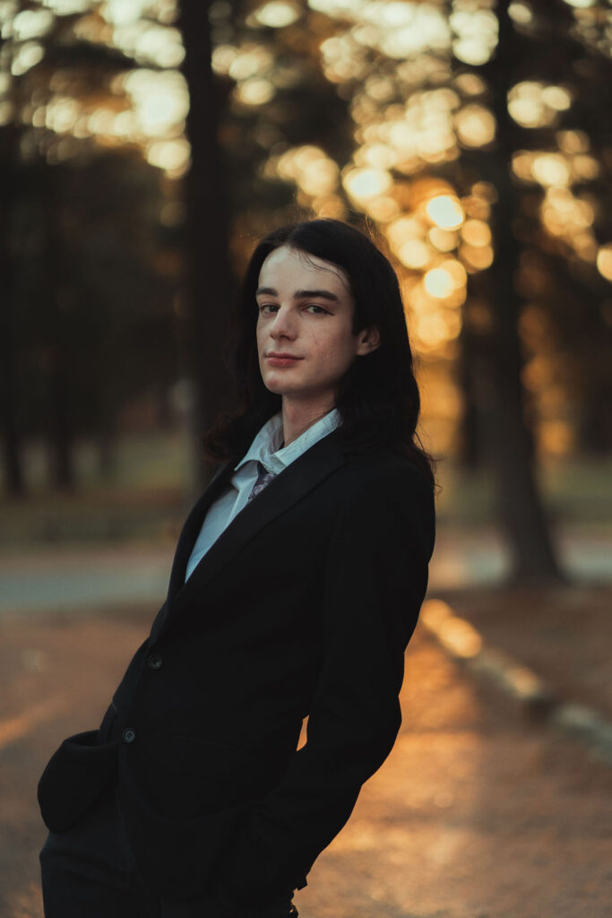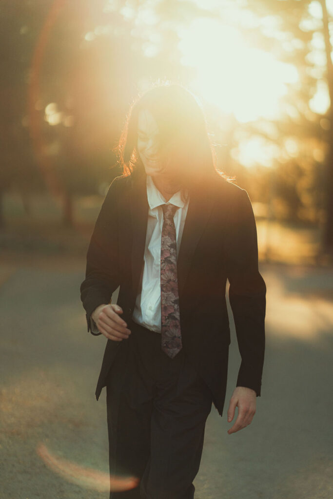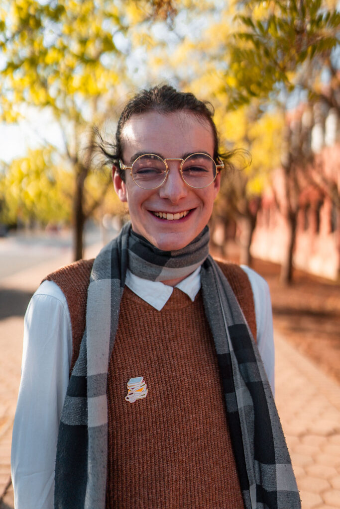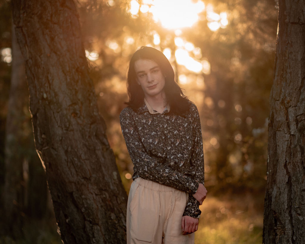 The outfit that became Leslie Grey. The beginnings of gender non-conformity, and probably the first time I properly tied my hair back (apart from my brother’s wedding). It still sticks out a bit at the sides. I need to figure out what to do when that happens. Tony and I shot these at Tuggeranong Library. I don’t wear glasses, by the way. But the more astute will notice they are the same I wore for Richard Grills in Dangerous Conceits. I…might have stolen them.