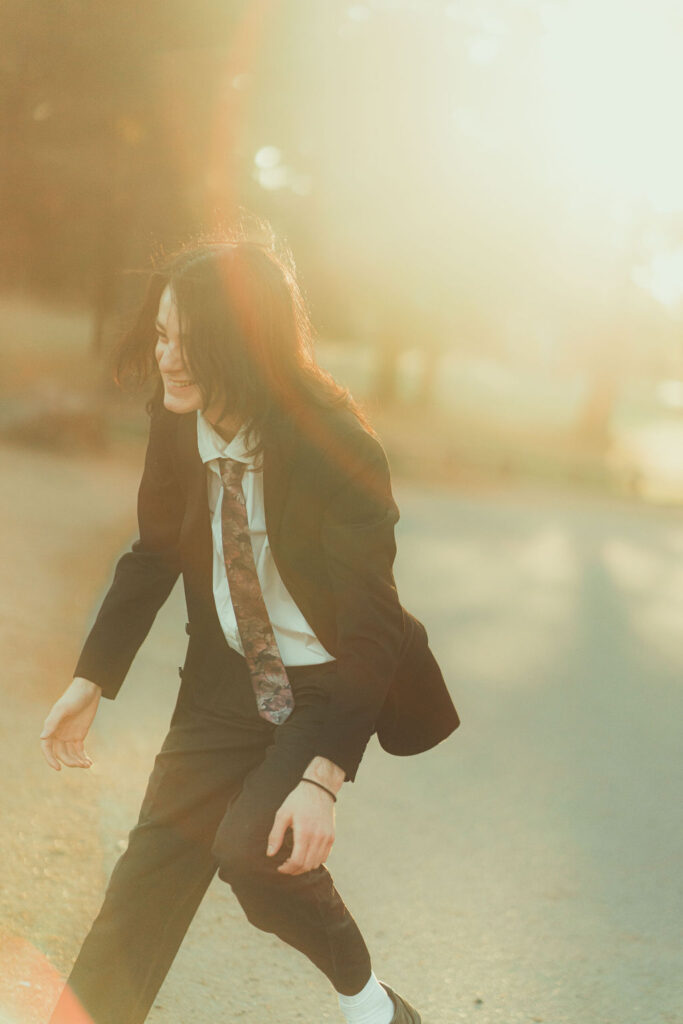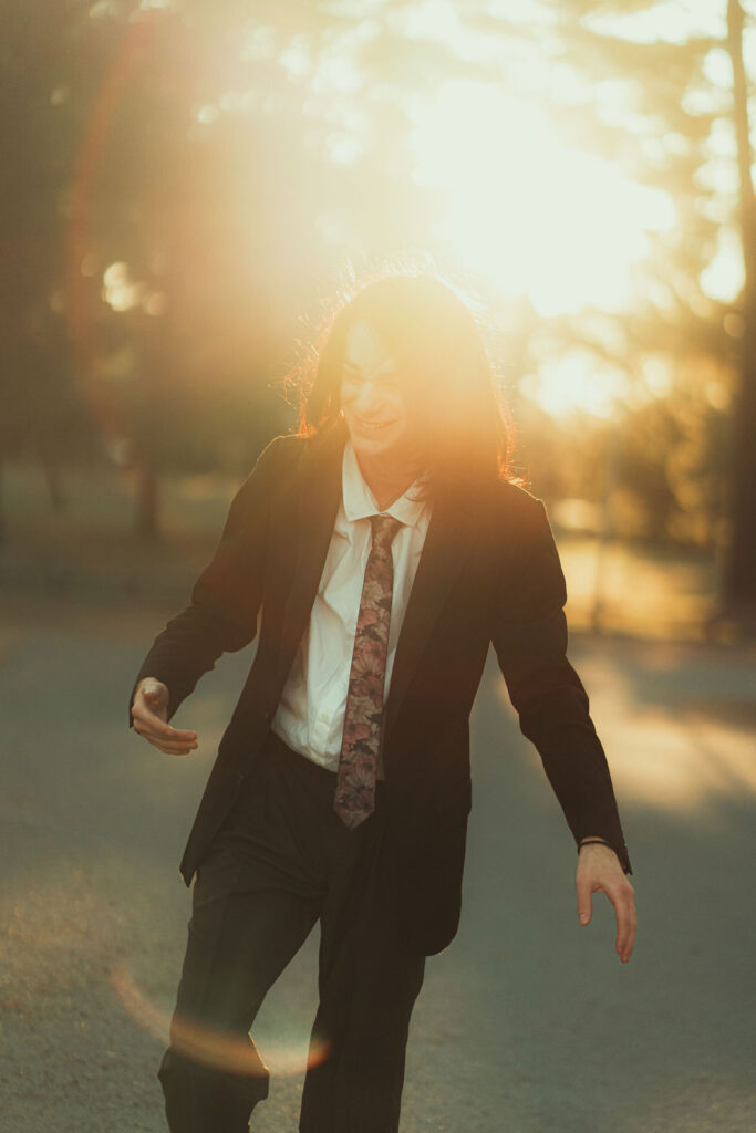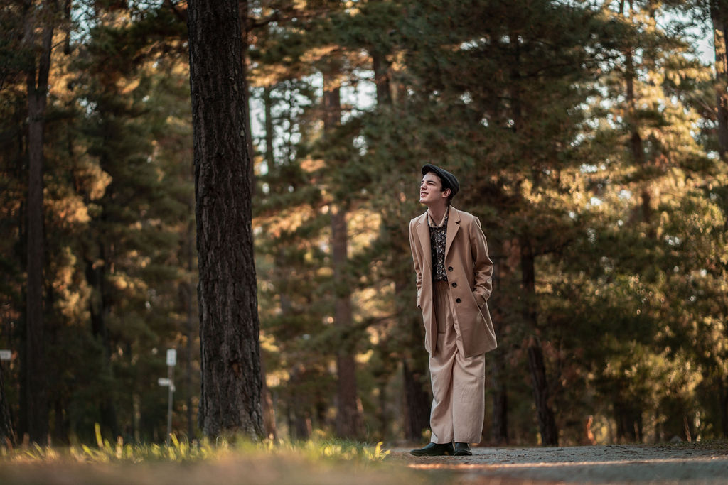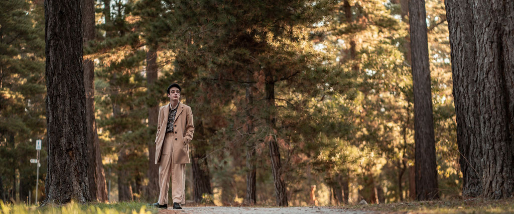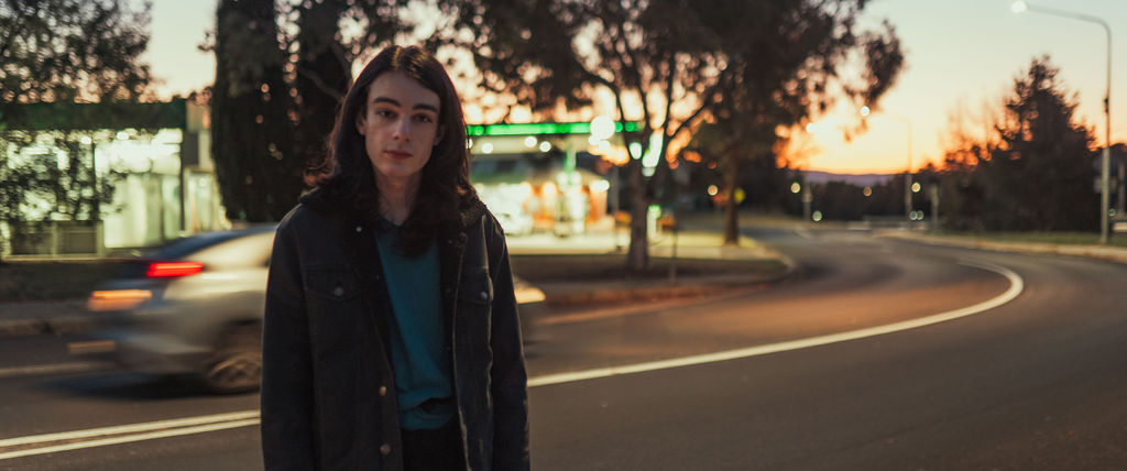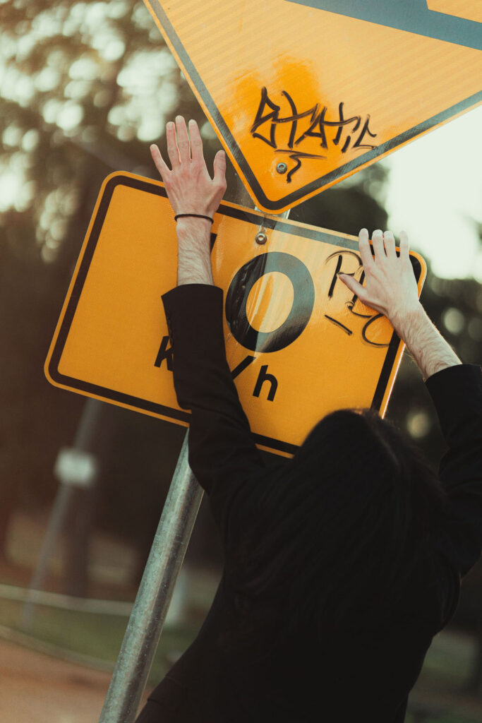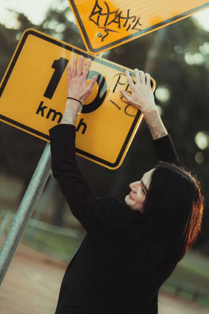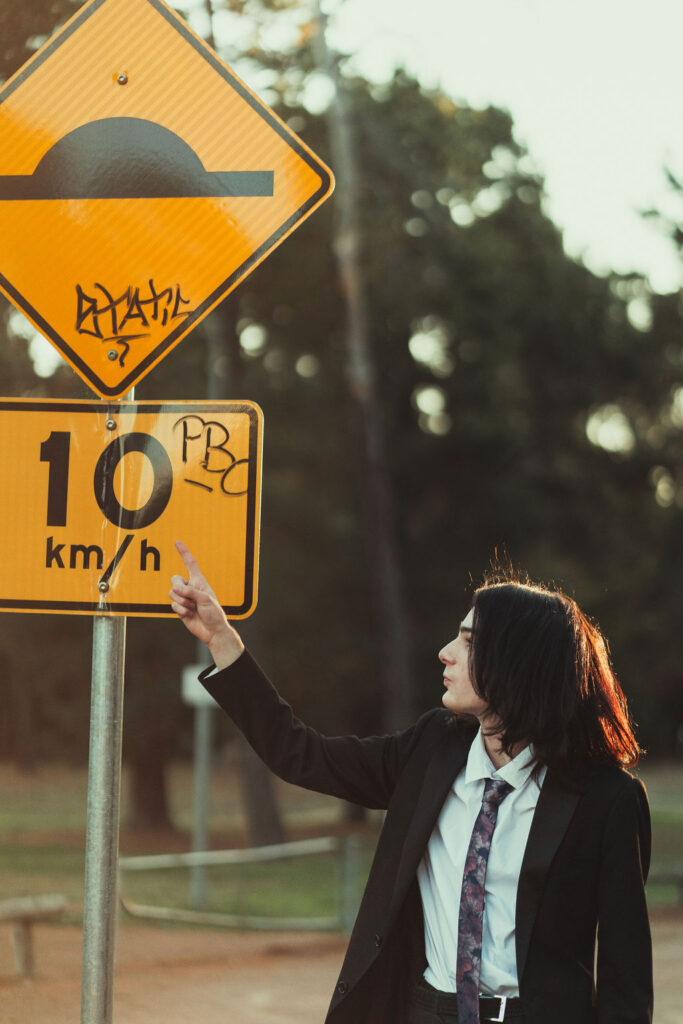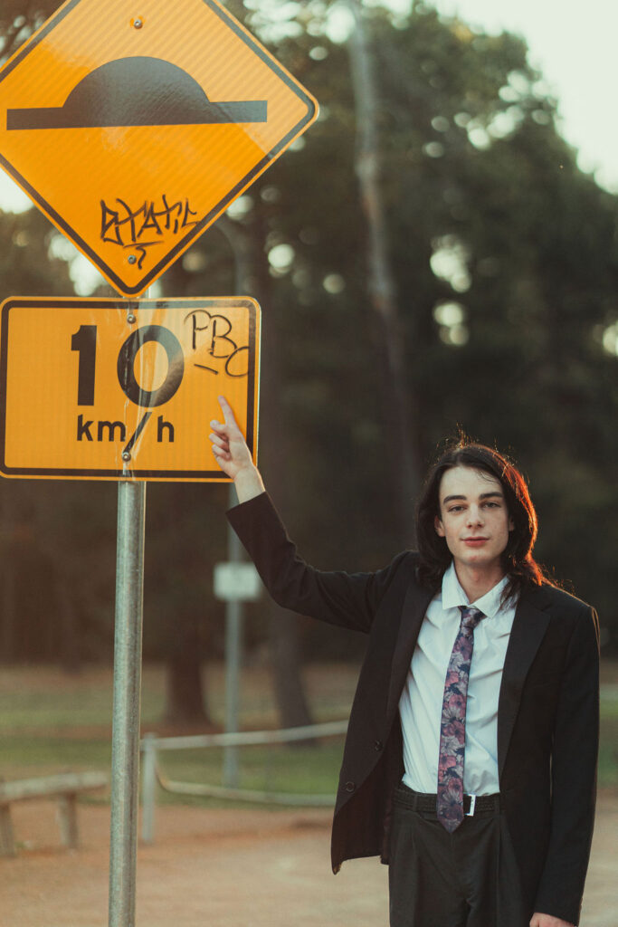 The “political campaign” was Tony’s idea. We went to the carpark of Fadden Pines In this, I struggle to tie a tie, attempt to climb up a road sign and also lean back in a way that felt weird at the time but looks really cool and artistic. The album cover for Just a Little Bit Mad is from this section.