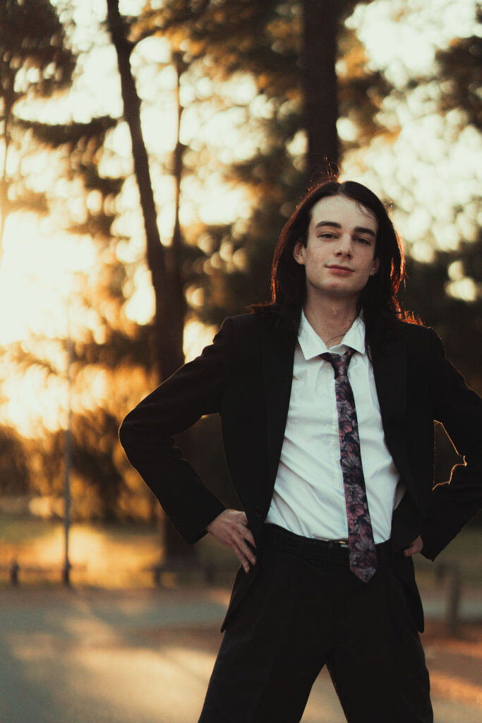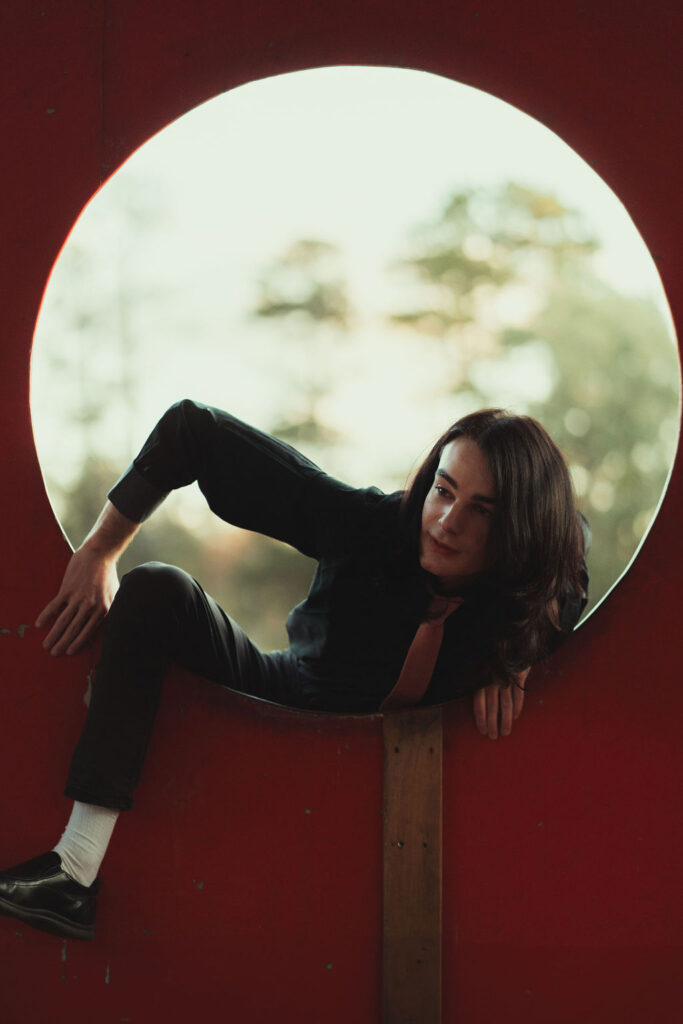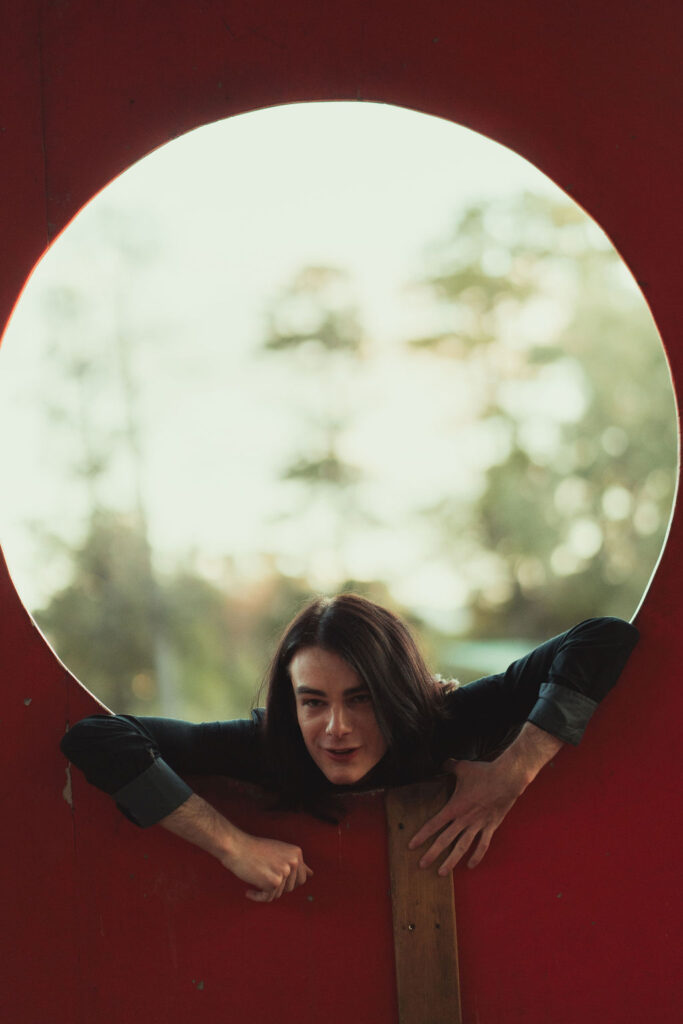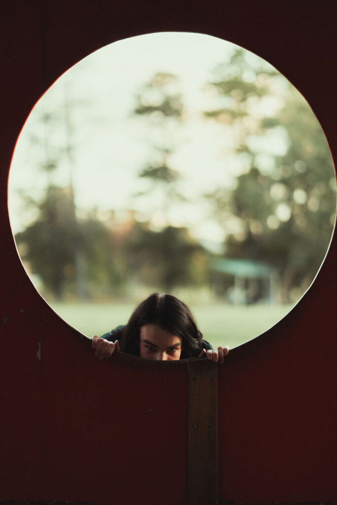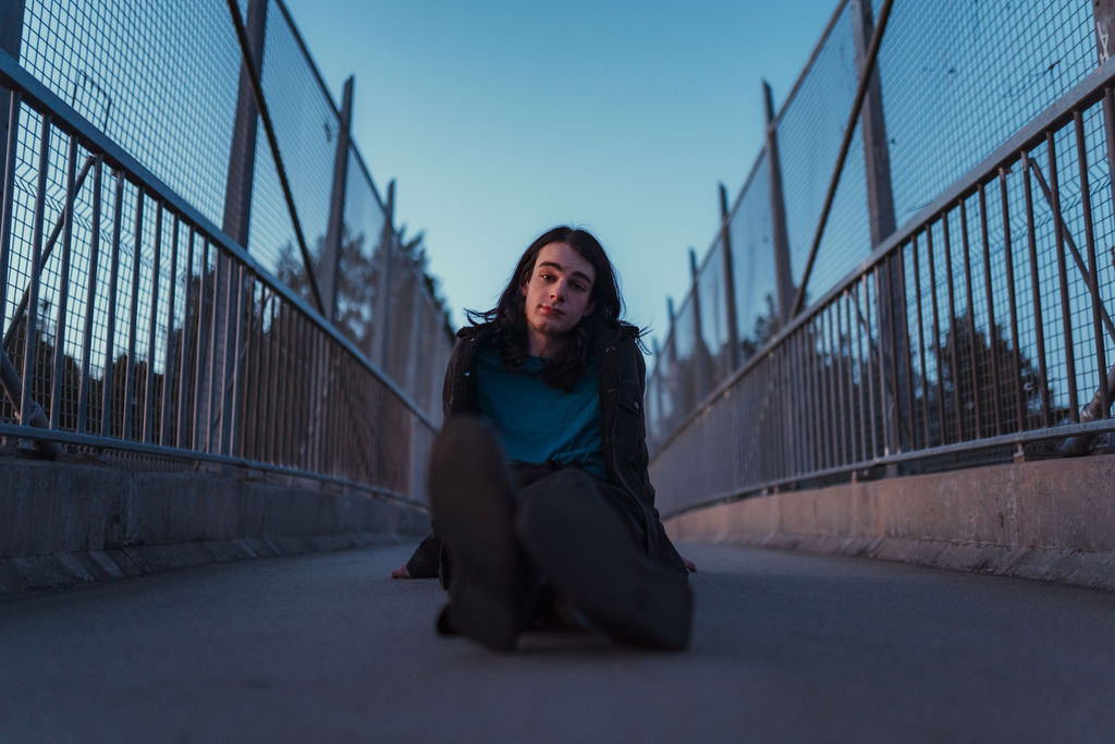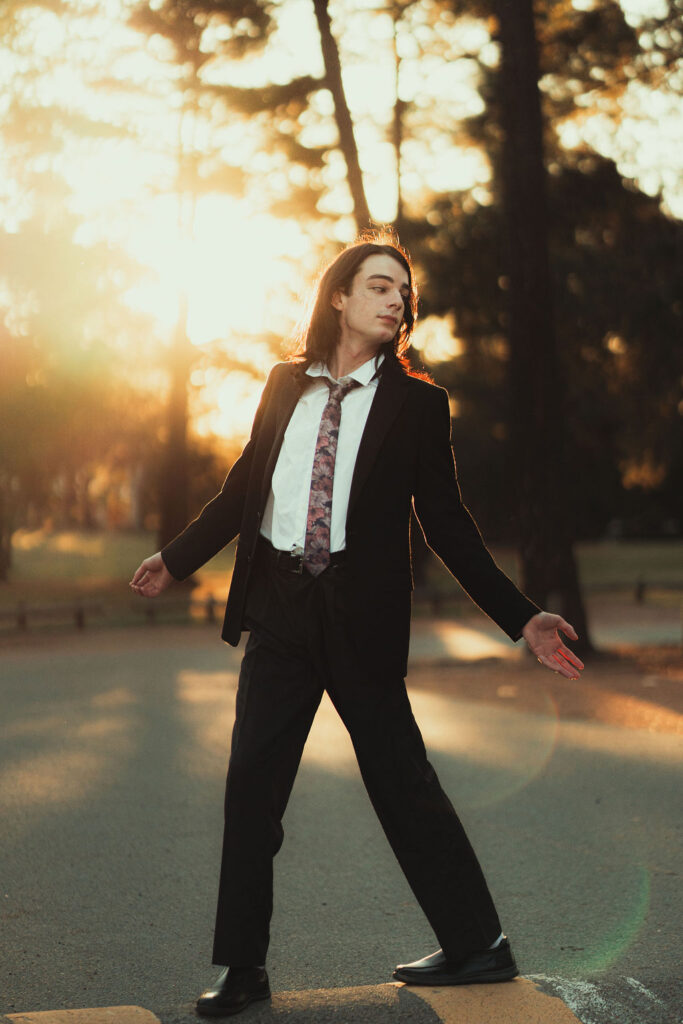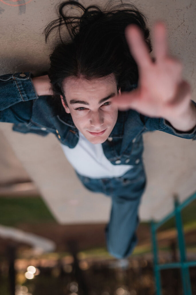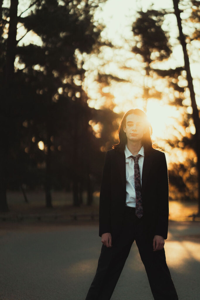 The “political campaign” was Tony’s idea. We went to the carpark of Fadden Pines In this, I struggle to tie a tie, attempt to climb up a road sign and also lean back in a way that felt weird at the time but looks really cool and artistic. The album cover for Just a Little Bit Mad is from this section.